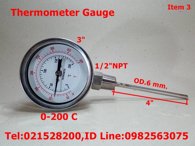ขนาดหน้าปัด 3”, 4” มีทั้งแบบเกลียวออกหลังและแบบเกลียวออกล่าง ขนาดเกลียว ½” NPT สแตนเลส ความโตของก้านวัดมีขนาด 6 mm. ยาว 2”, 4”