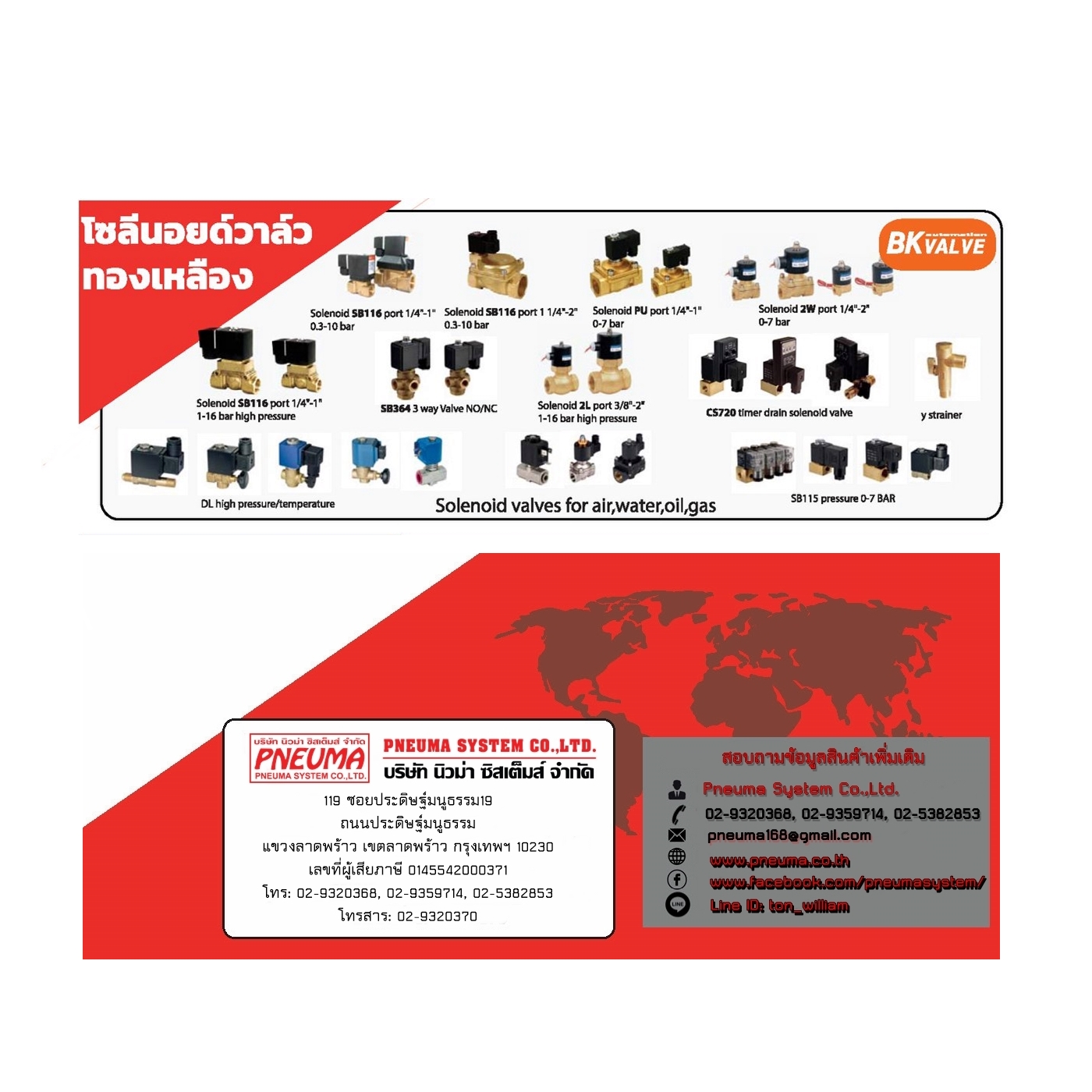 (Air filter Regulator Lubricator),ชุดวาล์ว ลม (Solenoid Valve)2/2,3/2,5/2,5/3,4/3 ,กระบอกลม(Air Cylinder) ,ชุดหัวขับลม(Sirca Actuator), โซลินอย์ดวาล์วน้ำ,ข้อต่อลม(Pneumatic Fitting),เกจวัดความดันคุณภาพสูง(Pressure Gauge)