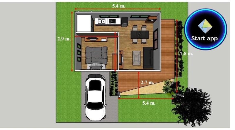 ขนาดตัวบ้าน : กว้าง 5.4 x ยาว 7.2 ม. สูง 3 ม.