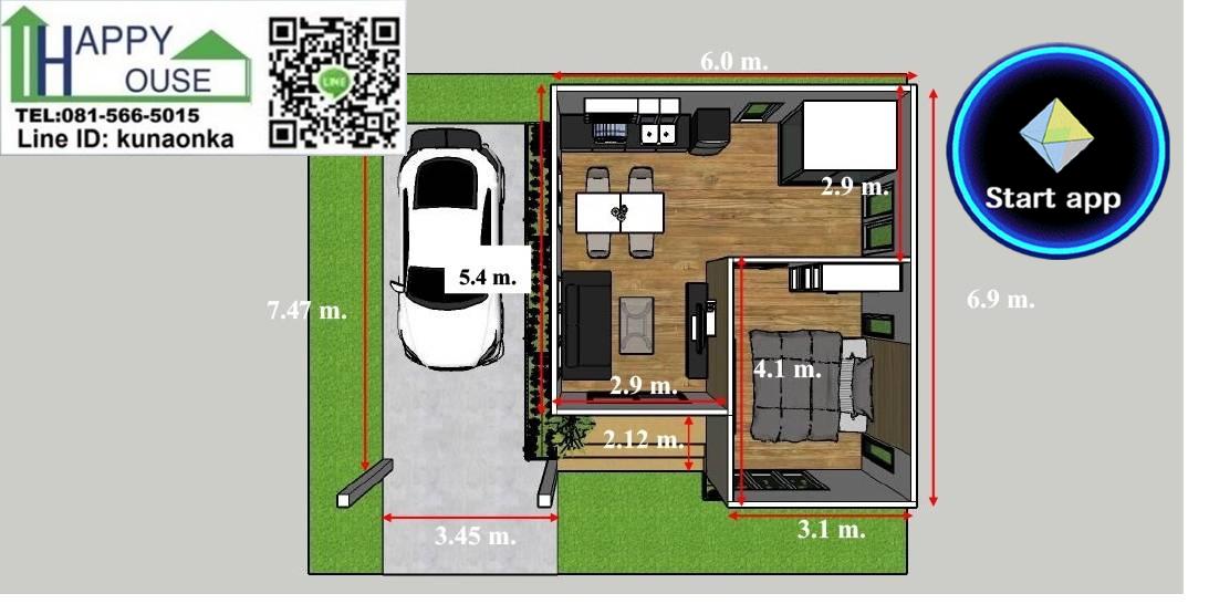 ขนาดตัวบ้าน : กว้าง 6 x ยาว 6.9 ม. สูง 3 ม.