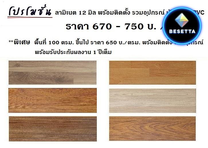- พื้นไม้ลามิเนต ขนาด 12 มิล ราคา 670-750 บ./ตรม. (พร้อมติดตั้ง