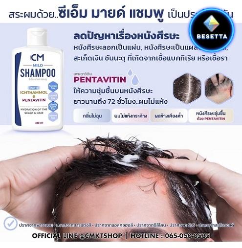 CM MILD SHAMPOO ผลิตภัณฑ์ทำความสะอาดหนังศีรษะมีส่วนผสมจากสารสกัดธรรมชาติด้วย ICHTHAMMOL ซึ่งมีฤทธิ์ฆ่าเชื้อแบคทีเรียที่เป็นสาเหตุของอาการไม่พึงประสงค์ หนังศีรษะลอกเป็นแผ่น, หนังศีรษะเป็นแผลตกสะเก็ดที่เกิดจากเชื้อแบคทีเรีย หรือเชื้อรา และสะเก็ดเงินบนหนังศีรษะ และเพิ่มความชุ่มชื้นให้หนังศีรษะด้วย PENTAVITIN