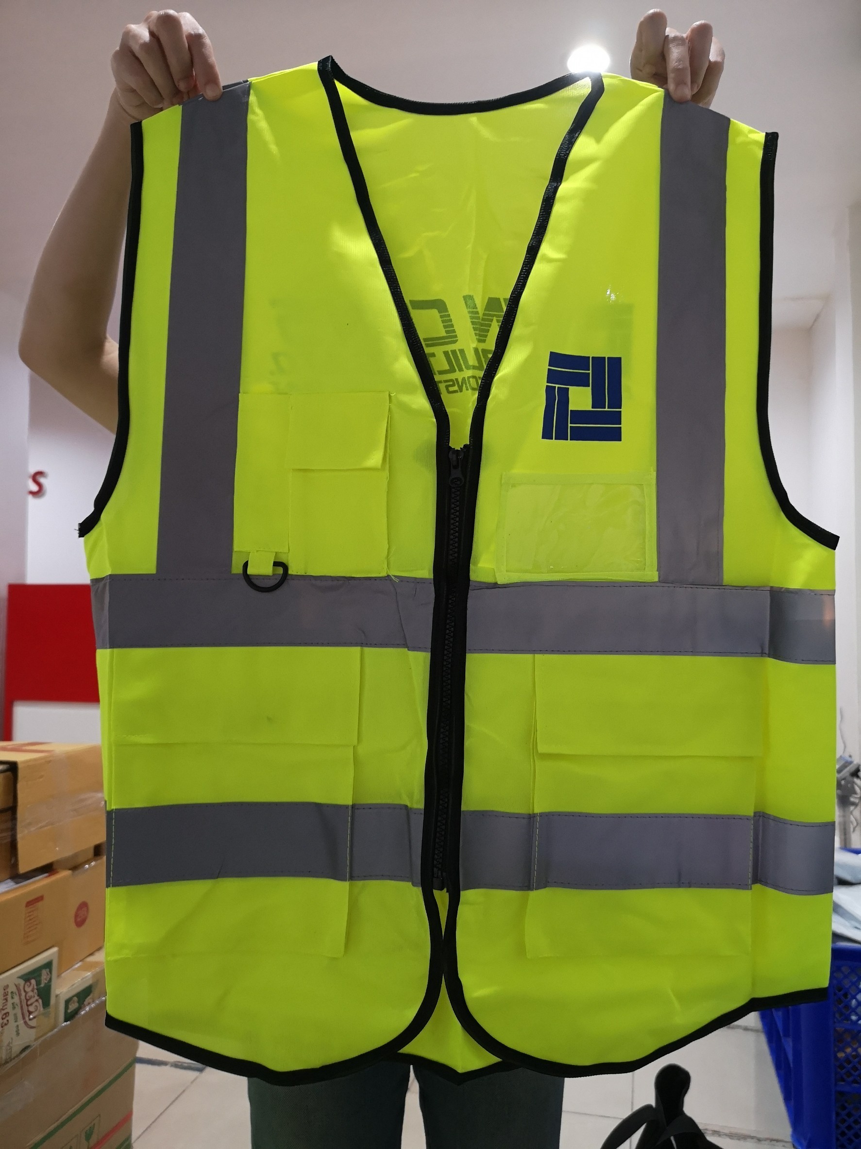 เสื้อกั๊กสีเขียวมะนาวติดแถบสะท้อนแสง มีช่องใส่บัตร และกระเป๋าเสื้อ