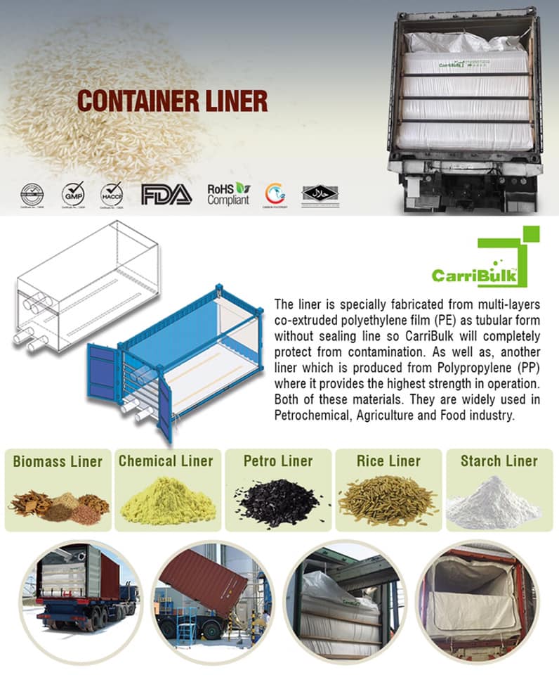 matter how your product is powder, grain, pellet, chip, clinker, etc. CarriBulk Container Liner is produced under industrial