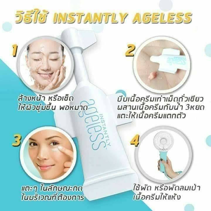 ใช้เป็นขั้นตอนสุดท้ายก่อนทางแป้ง ใช้ Instantly Ageless ทาบางๆ บริเวณที่ต้องการ ทิ้งไว้ 2-3นาที เพื่อให้เนื้อครีมชึมซาบเข้าสู่ผิว และ ร่องลึก เพื่อประสิทธิภาพในการยกกระชับและสามารถเห็นผลได้ชัดในทันที