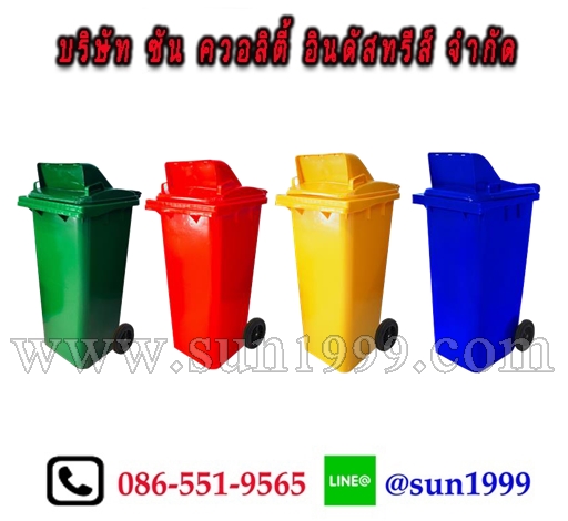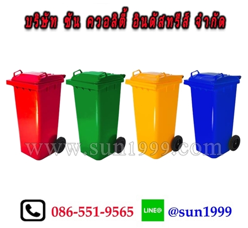 บ.ซัน ควอลิตี้ อินดัสทรีส์ จก. ศูนย์รวมถังขยะกว่า 1,000 แบบ หลายชนิด เช่น ถังขยะพลาสติก ถังขยะสแตนเลส ถังขยะยางรถยนต์ ถังขยะมีล้อ ถังขยะทรงกลม ถังขยะทรงเหลี่ยม ถังขยะใส ถังขยะ ถังขยะเท้าเหยียบ ถังขยะแยกประเภท มีถังขยะตั้งแต่ขนาดเล็ก 3 ลิตร,5 ลิตร,10 ลิตร,15 ลิตร,20 ลิตร,30 ลิตร,40 ลิตร,60 ลิตร,70 ลิตร จนถึงถังขยะขนาดใหญ่ 100 ลิตร,150 ลิตร,200 ลิตร,240 ลิตร และ 660 ลิตร สนใจมาเลือกชมถังขยะราคาถูก ได้ที่หน้าร้าน ถนนพระราม2 ติดกับ โรงพยาบาลพระราม2 หรือติดต่อสอบถามเพิ่มเติมได้ที่ Office : Tel. (02)416-4968-9 Fax.(02)416-4967 Hotline : 086-551-9565 (True) คุณเอ๋ : 099-150-9515 (True) คุณเอ๋ : 062-659-1463 (True) คุณสุ : 084-146-5022 (True) คุณสุ E-mail : sun1999_q@hotmail.com Line : @sun1999 facebook : https://www.facebook.com/sunquality