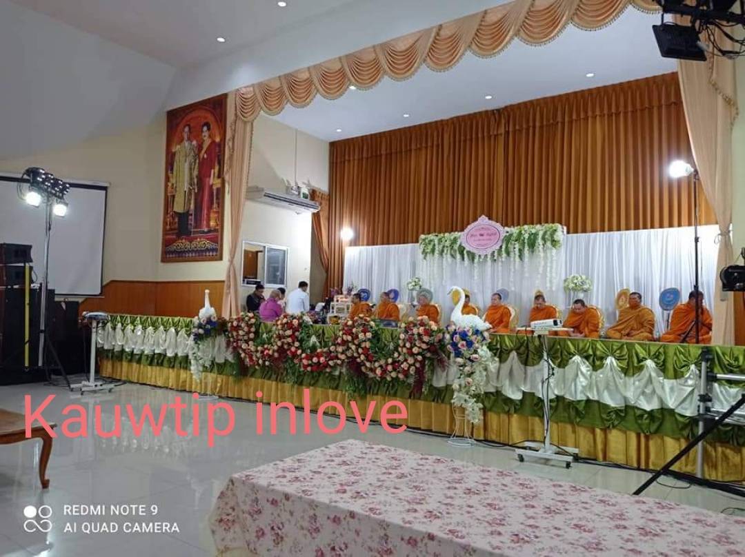 1. ฉากผ้าพิธีสงฆ์ 6- 9 เมตร สีครีมทองที่ทางร้านมี (ไม่ใช่โครงเหล็กโรยผ้า