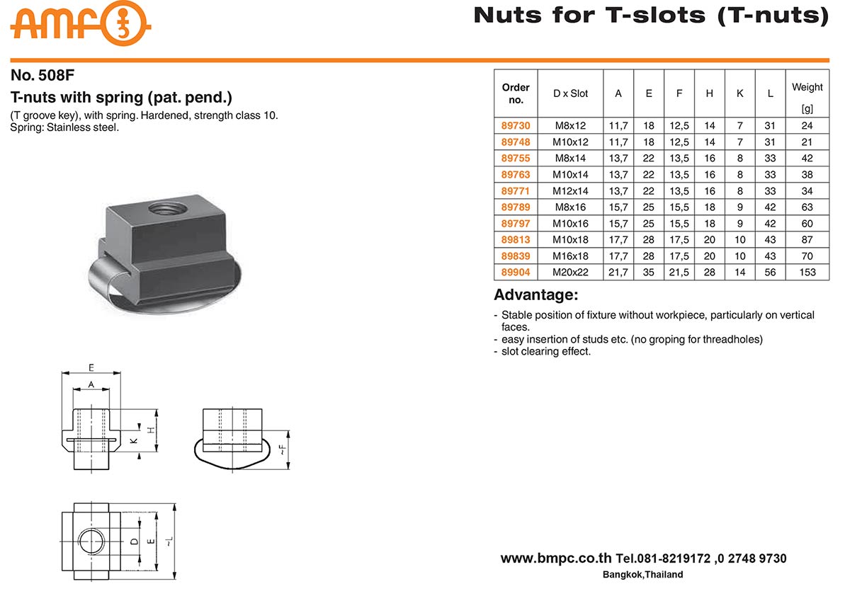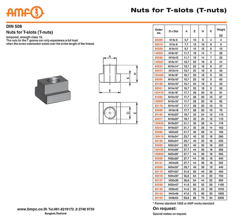AMF, Clamp, T-slot bolt, T-nut, Hook wrench, Heavy washer, Dished washer, Extension nut, collar nut