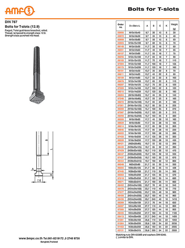 T-slot bolt  DIN 787 : class 8.8, 12.9  Size M6-M42