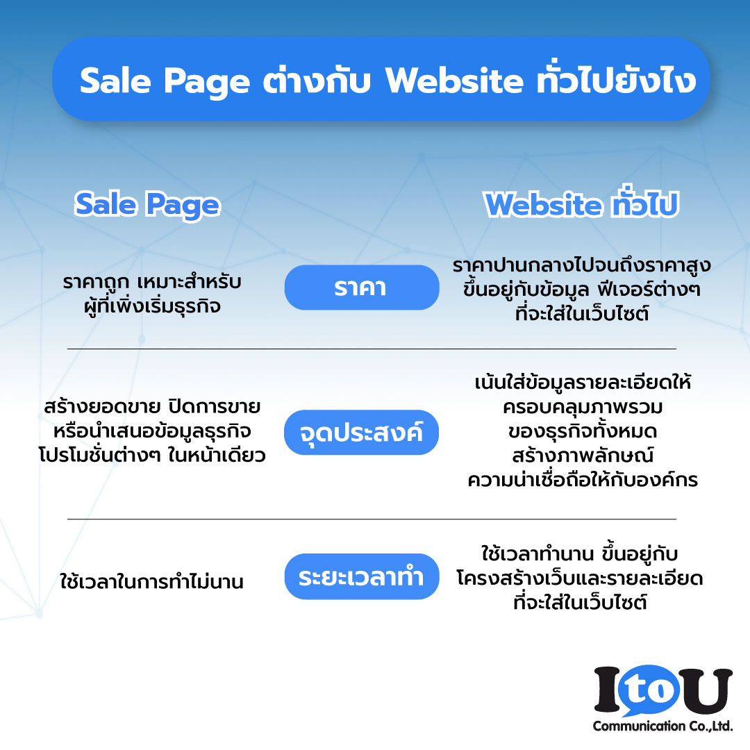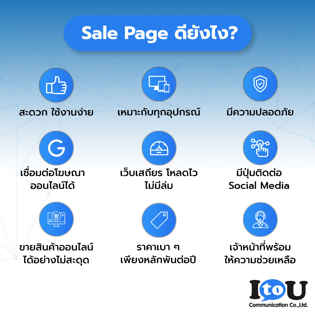 'Sale Page' ออกแบบมาเพื่อผู้ประกอบการธุรกิจ พ่อค้าแม่ขายออนไลน์ หรือผู้ที่ต้องการมีเว็บไซต์เป็นของตัวเอง ในรูปแบบเว็บไซต์ที่แสดงข้อมูลธุรกิจ หรือสินค้าครบจบในหน้าเดียว ให้ลูกค้าของคุณเข้าถึงข้อมูลได้สะดวก ง่ายมากขึ้น พร้อมฟังก์ชันที่จัดเต็ม ทั้งระบบ Shopping Cart และสามารถต่อยอดให้การขายมีประสิทธิภาพ อย่าง Google Tag Manager, Facebook Pixel, Tiktok Pixel, LINE Tag เรียกได้ว่า แม้ไม่มีความรู้ด้านโปรแกรมเมอร์ ก็มีเว็บไซต์ได้ ดียังไงอ่ะหรอ? อ่านต่อสิ • ใช้นำเสนอข้อมูลธุรกิจ ขายสินค้า และปิดการขายได้อย่างมีประสิทธิภาพ • ดีไซน์เว็บไซต์สวยหรูหลักแสน แต่คุณจ่ายเพียงหลักพัน • สะดวก ใช้งานง่าย พร้อมระบบความปลอดภัยสูงสุด • เว็บเสถียร โหลดไว ไม่มีล่ม • รองรับการโฆษณา Google, Facebook, LINE • ให้ลูกค้าของคุณช้อปสินค้าได้ง่ายขึ้น ผ่านระบบ Shopping Cart นี่แค่ฟีเจอร์หลักๆ ส่วนหนึ่งเท่านั้นนะ มารู้จัก Sale Page ให้มากขึ้นกันดีกว่า ???? https://bit.ly/3iVQZYV I to U : Connect to you, Always เราพร้อมเปลี่ยนธุรกิจ พิชิตยอดขาย ???????? ยกระดับแบรนด์ของคุณให้สำเร็จบนโลกออนไลน์อย่างยั่งยืน ด้วยกลยุทธ์ระดับมืออาชีพ ประสบการณ์มากกว่า 10 ปี สนใจปรึกษาฟรี! สอบถามข้อมูลเพิ่มเติม : Call : 02 689 3855 EXT. 12 Email: marketing@i2u.co.th Web : https://www.i2u.co.th FB : https://m.me/I2U.communication