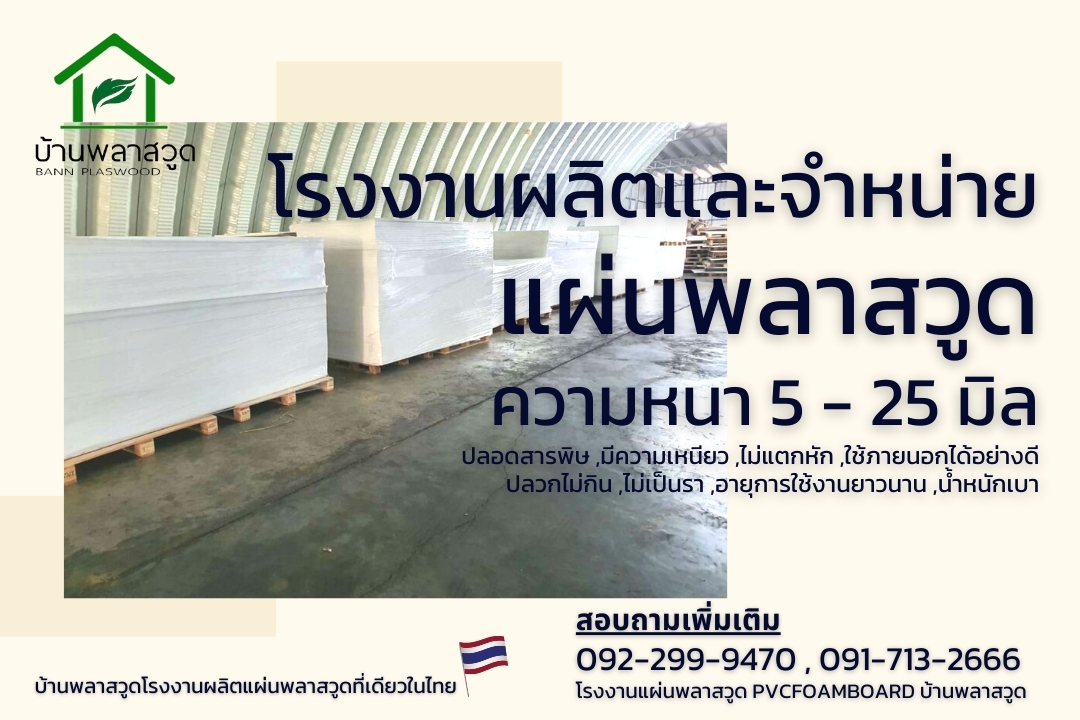 บ้านพลาสวูดเป็นโรงงานผลิตและจำหน่ายแผ่นพลาสวูดเกรดพรีเมี่ยม ไร้สารพิษแห่งเดียวในประเทศไทย จัดส่งได้ทั่วประเทศ