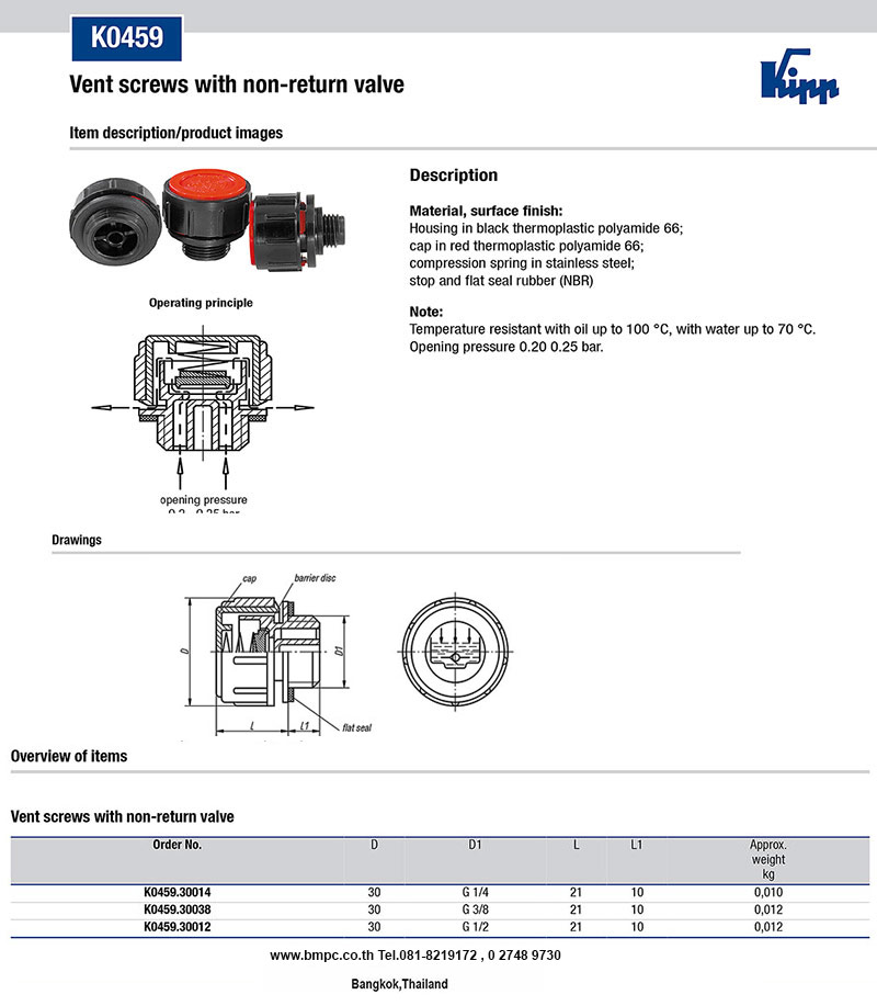Note: Opening pressure 0.20 – 0.25 bar. Temperature range: Temperature resistant with oil up to 100°C.